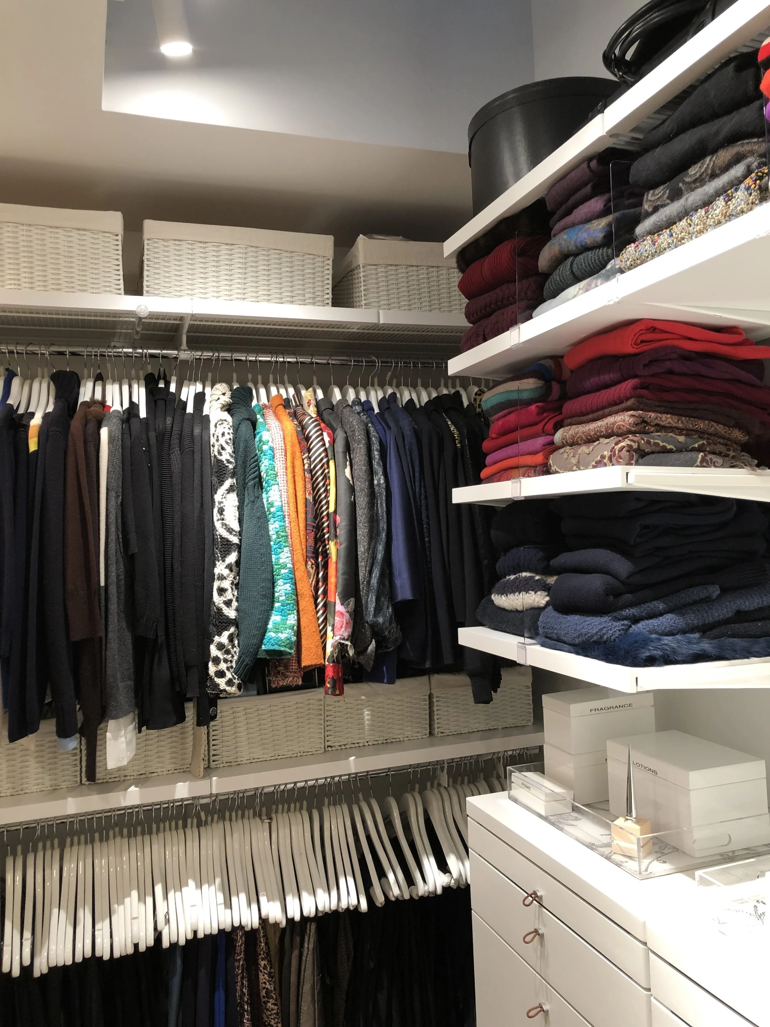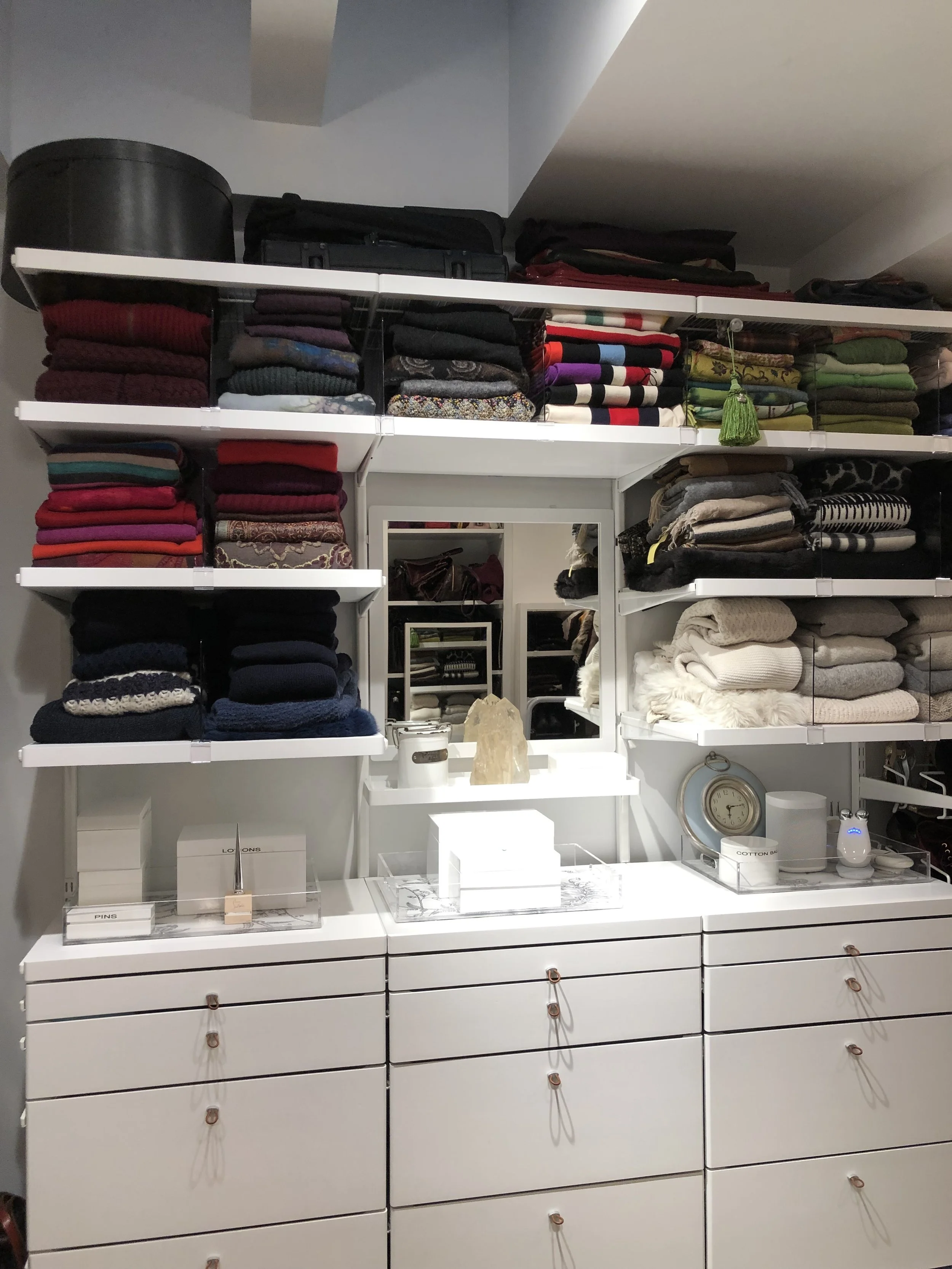 Now that the hanger issue was solved, it was time to tackle sweaters. I categorized the sweaters into basic and fancy. Basics went into drawers and were sorted by color, style, fabric: i.e.: black - sleeveless, t-neck, crewneck — cashmere, wool, cotton. The Container Store sells dividers for the Elfa mesh drawers I used, which worked like a dream. Each sweater drawer held two dividers that created 3 compartments. I used the Marie Kondo burrito folding method and voila’ instant organization. The fancy sweaters were folded and placed on the shelf by color.