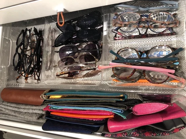 My favorite drawer in the closet is the drawer for my glasses. 👓🕶 Oddly enough it was a life changer. It wasn’t something I planned but was inspired by an item I found at the Container Store that slipped into the mesh drawers and provided small compartments. I used it for my glasses, which I have many! Sunglasses, reading glasses, eye glasses, etc. and I am ALWAYS losing or misplacing one or the other. Now they're divided by type and style, and I'm never in need of finding a pair of glasses again!