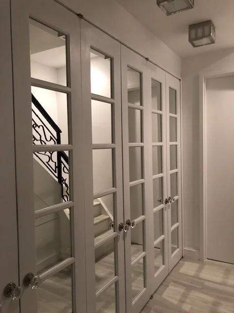 Lesson #3 - Let the space dictate the design. You must take clues from your space, and although I wanted to get the most impact for the buck, the landing called for a simpler door. My contractor Arthur created a hybrid frame design that perfectly fit the space and we went with a traditional French door with eight mirrored panels and beautiful articulated knobs. Enough pizazz to make it feel a bit old world, but modern enough to satisfy the space.